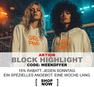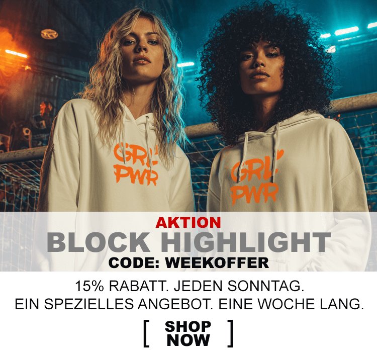 * 15 % Rabatt auf unseren Hoodie mit dem Motiv "GRL PWR" in unserem BLOCK Highlight der Woche. Kein Mindestbestellwert. Keine Versandkosten.
