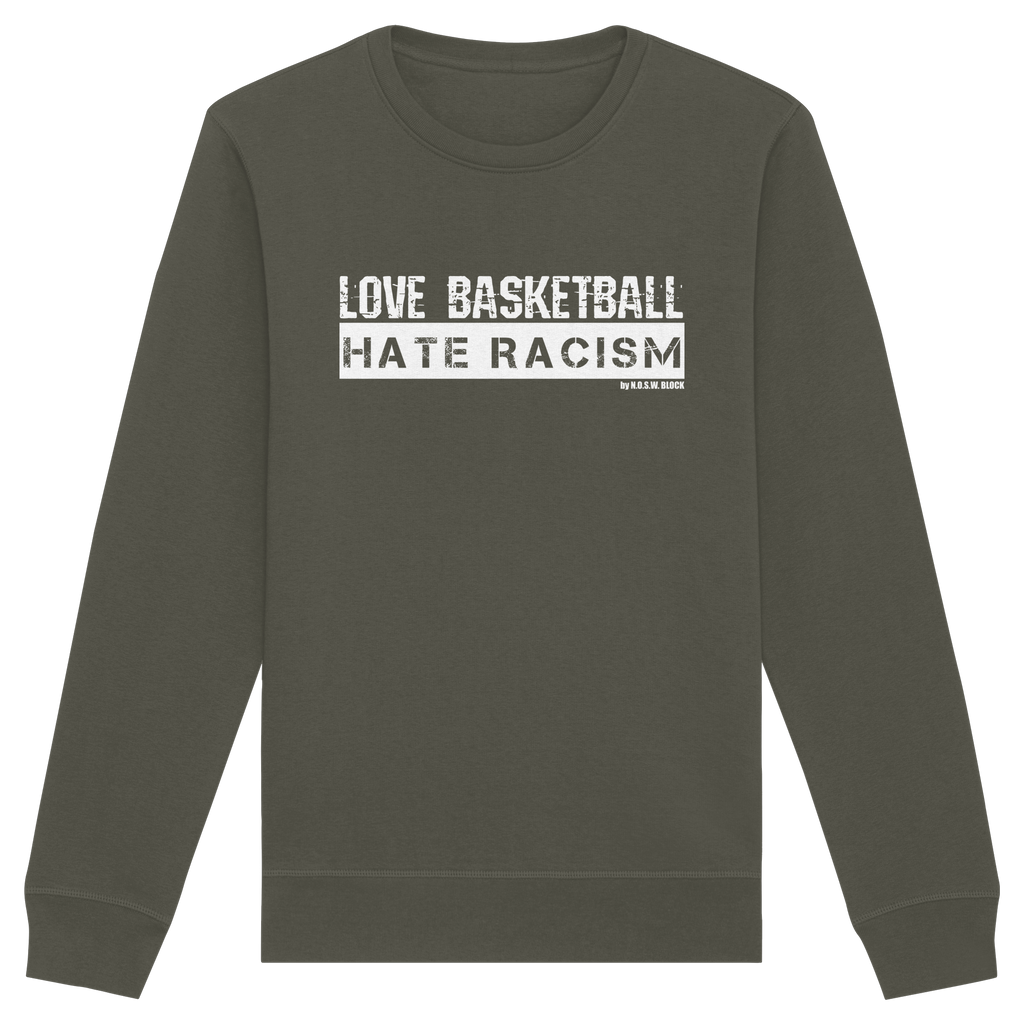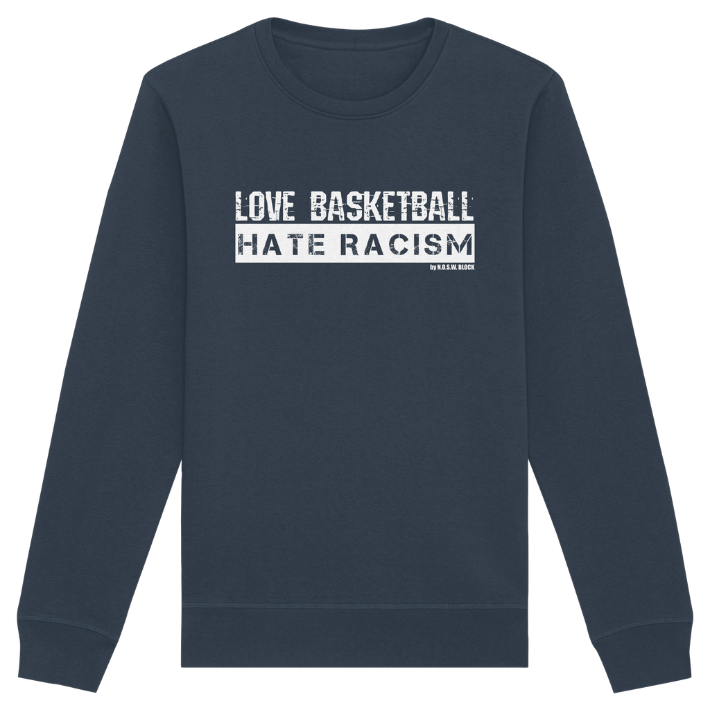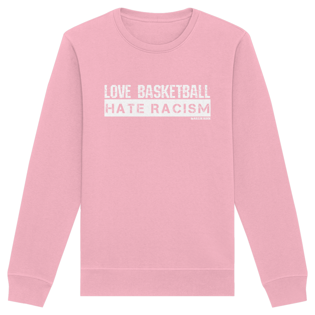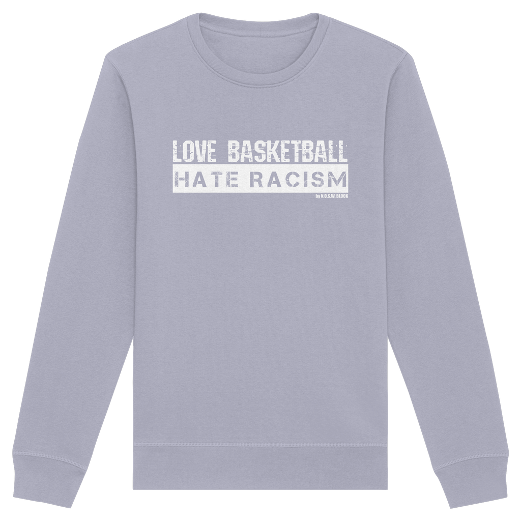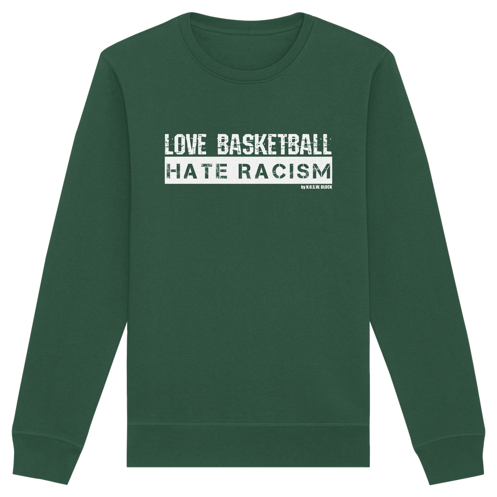 N.O.S.W. BLOCK Gegen Rechts Organic Basic Sweater mit Brust-Druck "LOVE BASKETBALL HATE RACISM" in den Farben black, french navy, red, anthrazit, royal blue, khkai, bottle green, dark heather grey, heather grey, india ink grey, cotton pink, serene blue und burgundy.