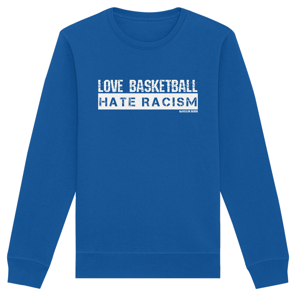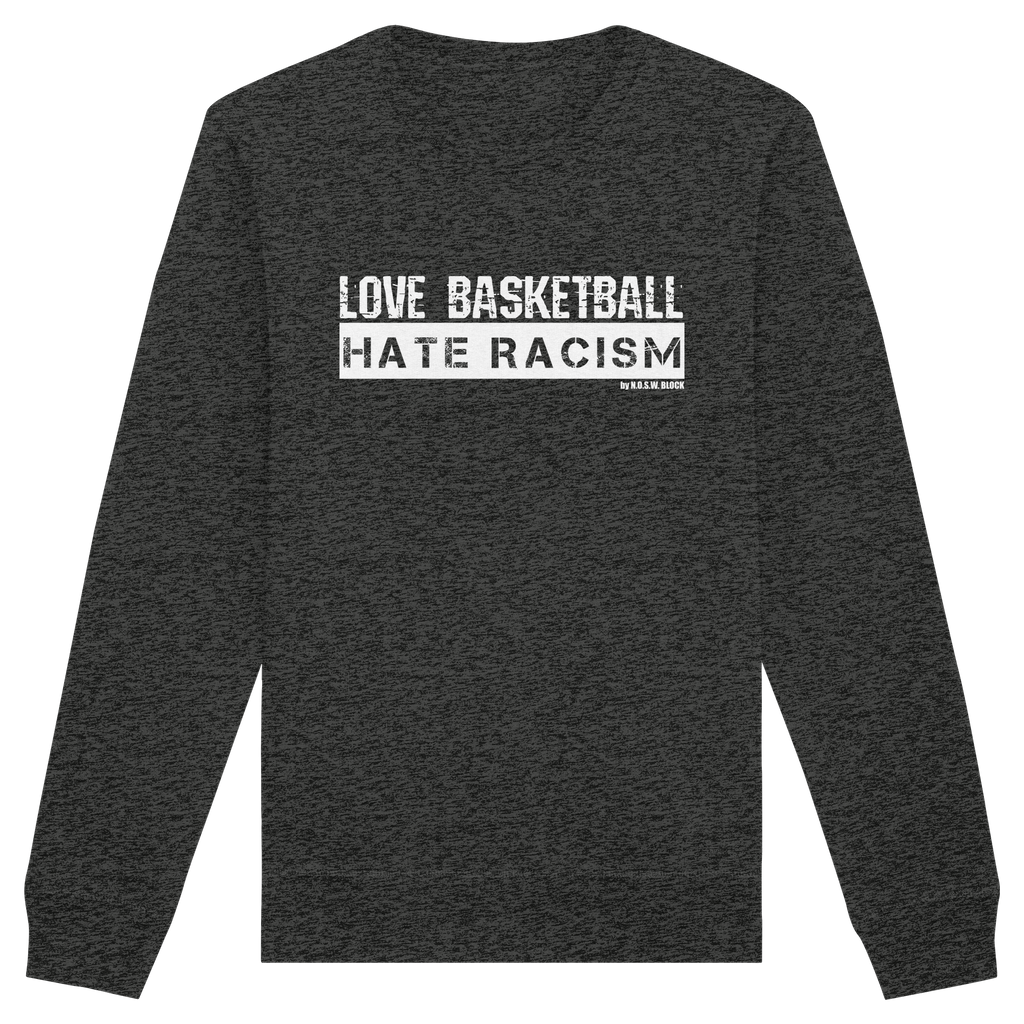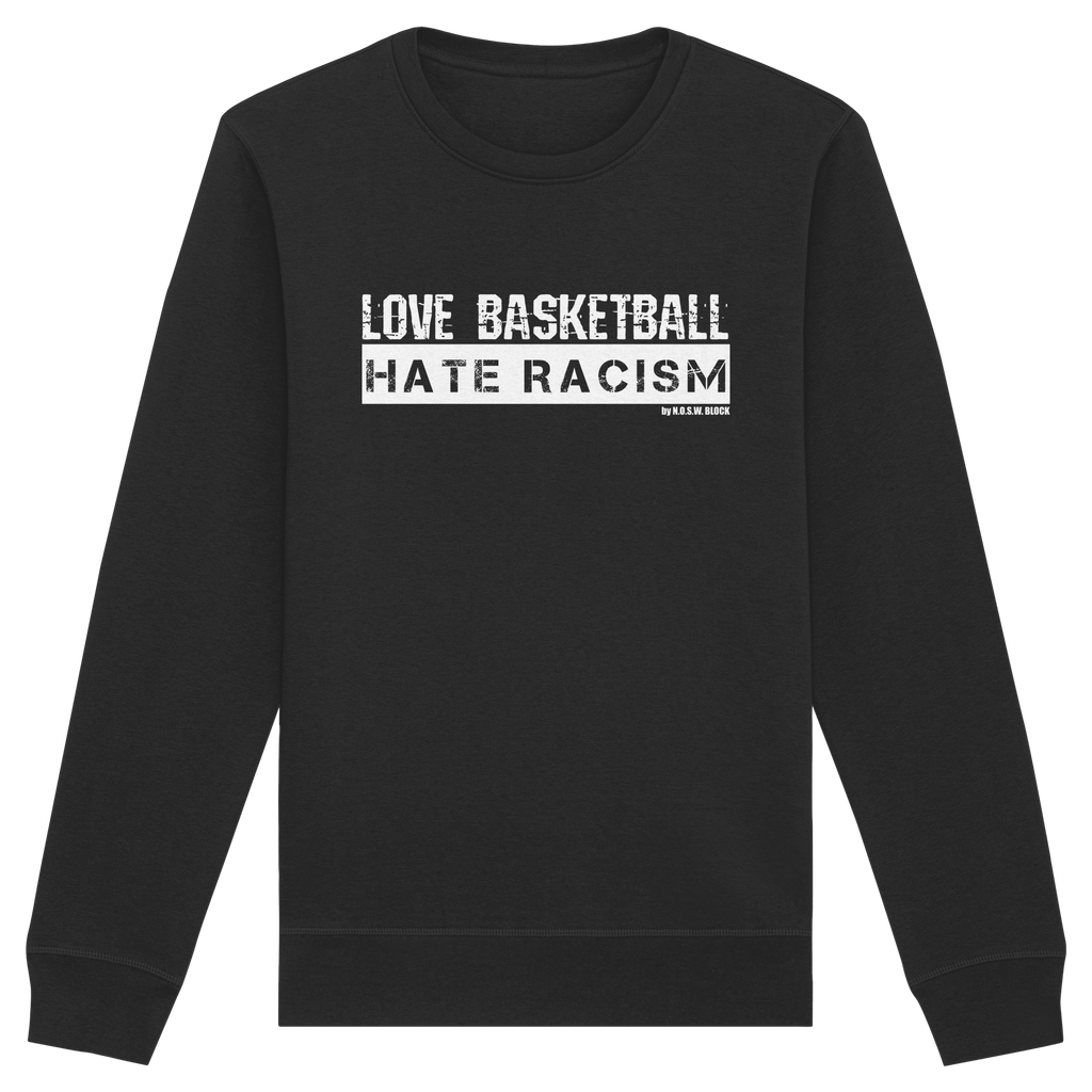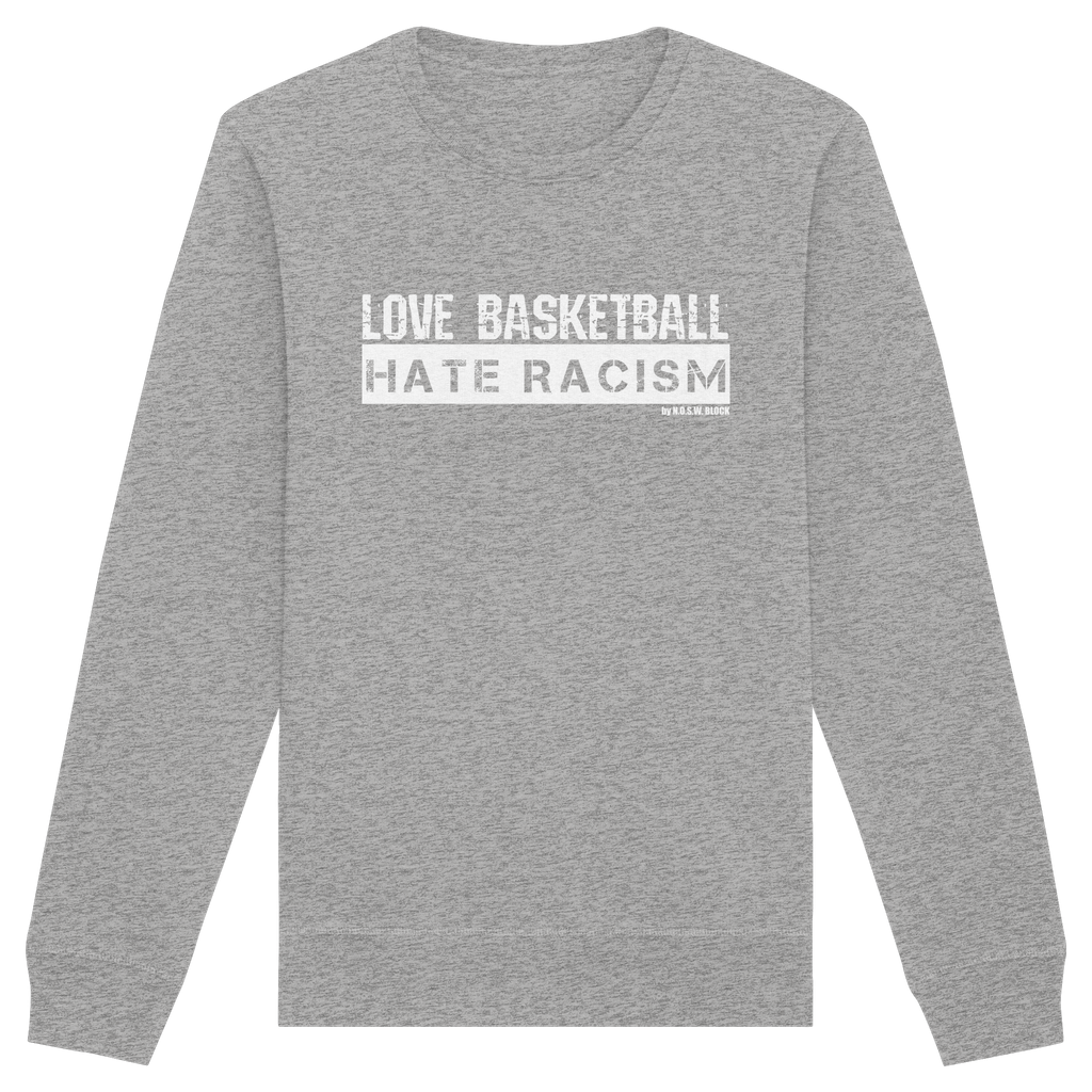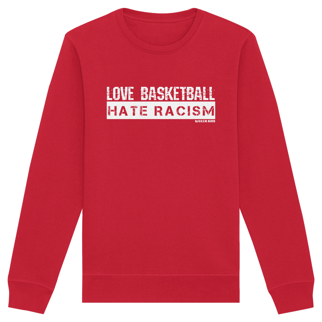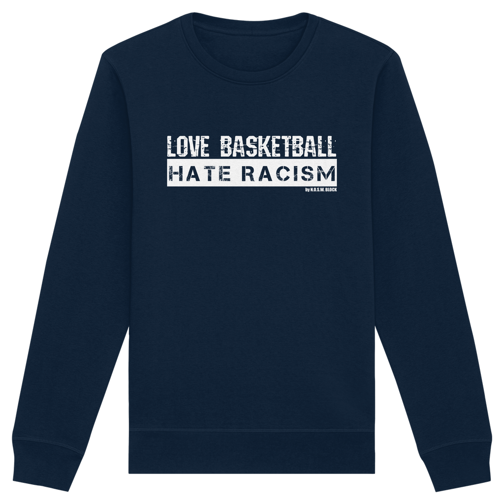 N.O.S.W. BLOCK Gegen Rechts Organic Basic Sweater mit Brust-Druck "LOVE BASKETBALL HATE RACISM" in den Farben black, french navy, red, anthrazit, royal blue, khkai, bottle green, dark heather grey, heather grey, india ink grey, cotton pink, serene blue und burgundy.