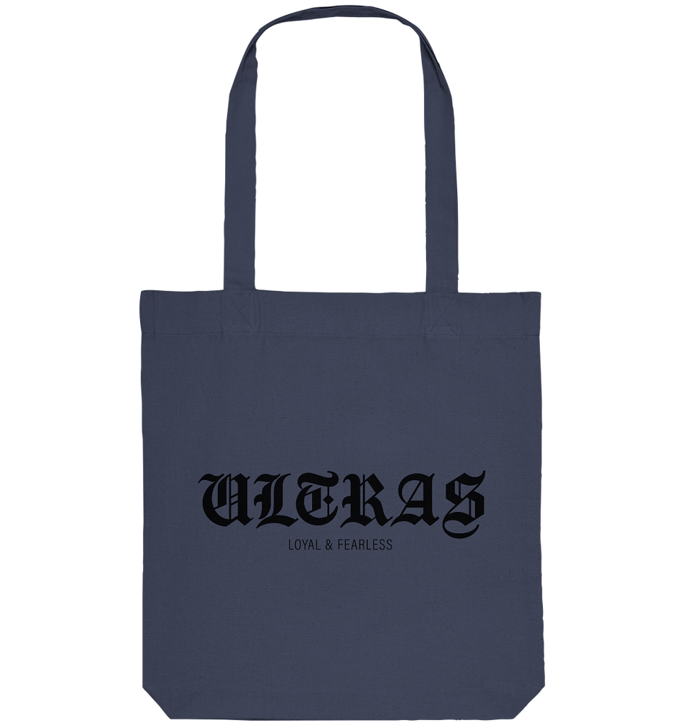 RIOT//GROUNDS Organic Baumwolltasche mit Front-Druck "ULTRAS LOYAL & FEARLESS" in den Farben natural, heather grau, dunkelblau und schwarz.