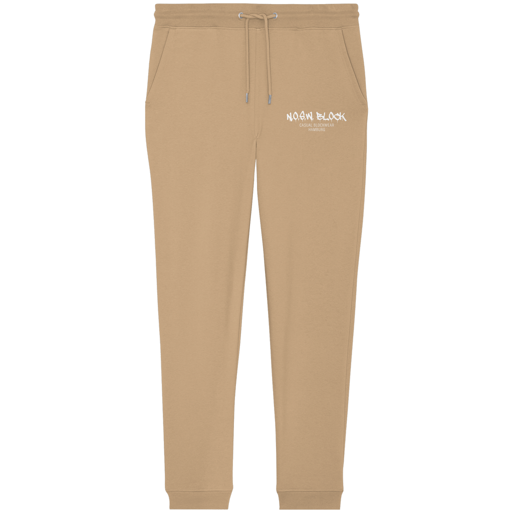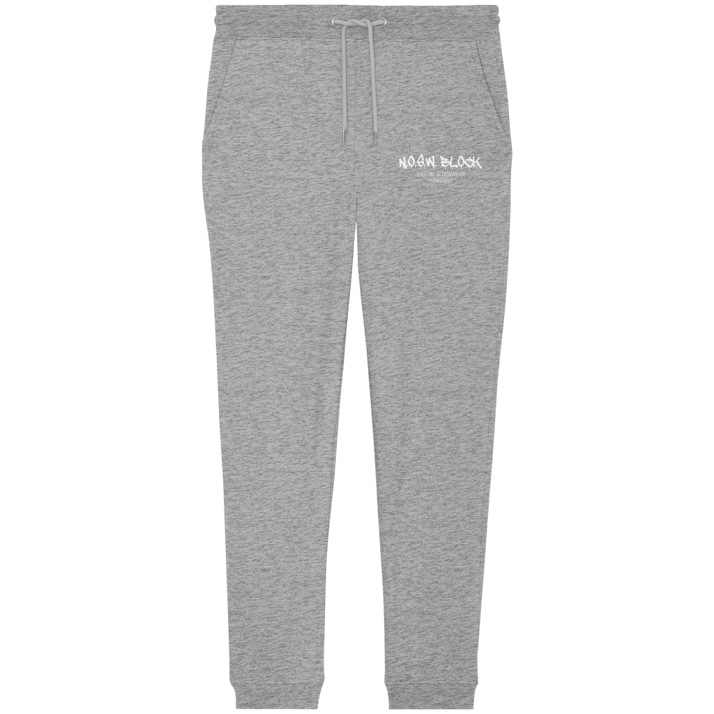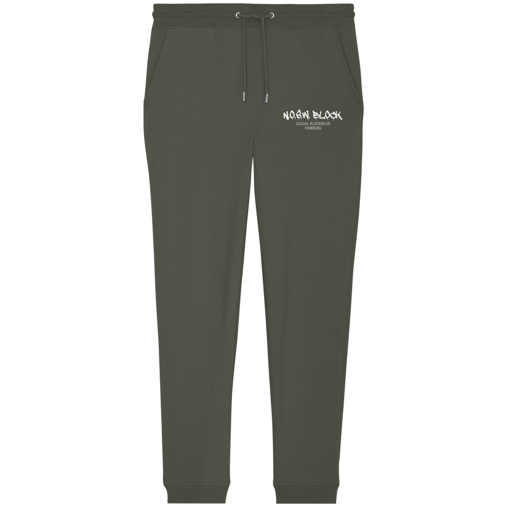 N.O.S.W. BLOCK Organic Jogger Pants mit Druck "N.O.S.W. BLOCK CASUAL BLOCKWEAR HAMBURG" in den Farben black, french navy, heather grey, khaki und latte.