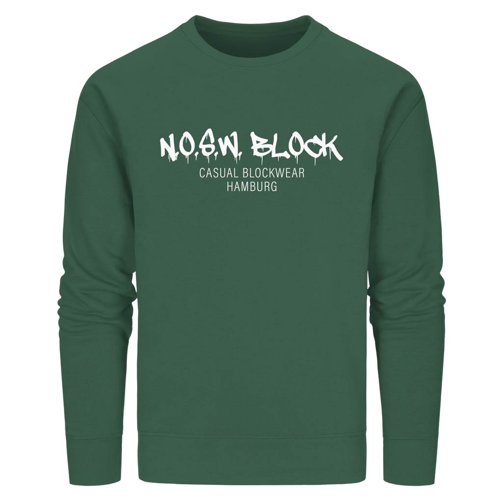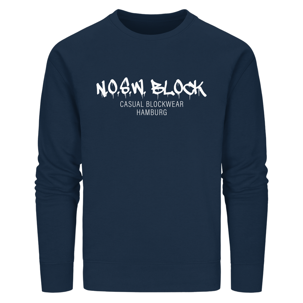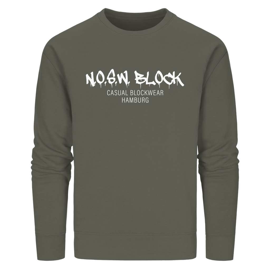 N.O.S.W. BLOCK Organic Sweater mit Brust-Druck "N.O.S.W. BLOCK CASUAL BLOCKWEAR HAMBURG" in den Farben black, french navy, anthracide, canyon pink, red, khaki, india ink grey, sky blue, royal blue, bottle green, dark heather grey und burgundy.