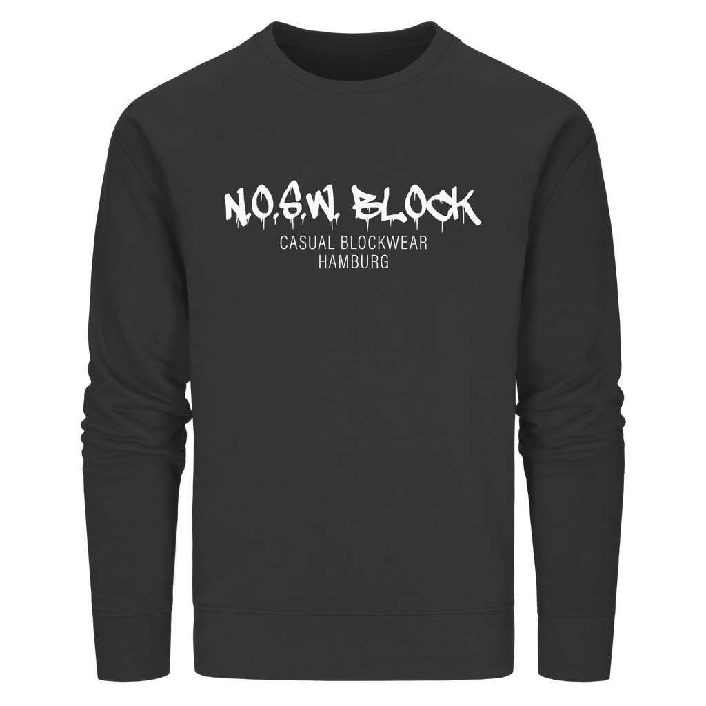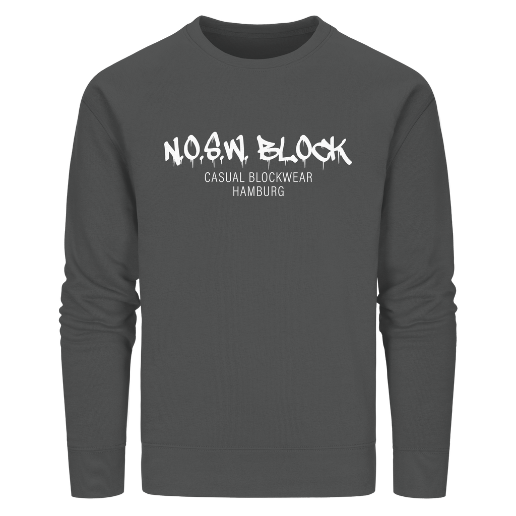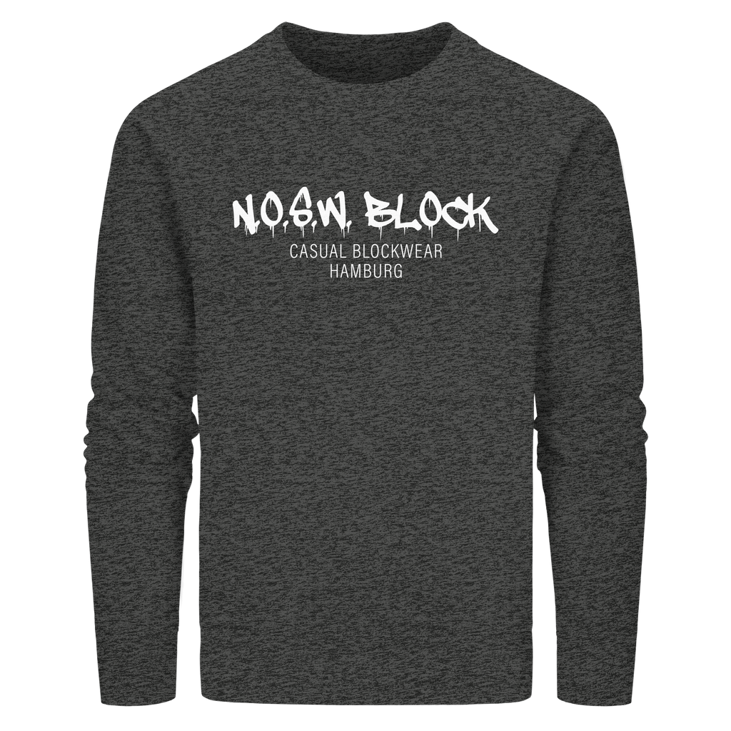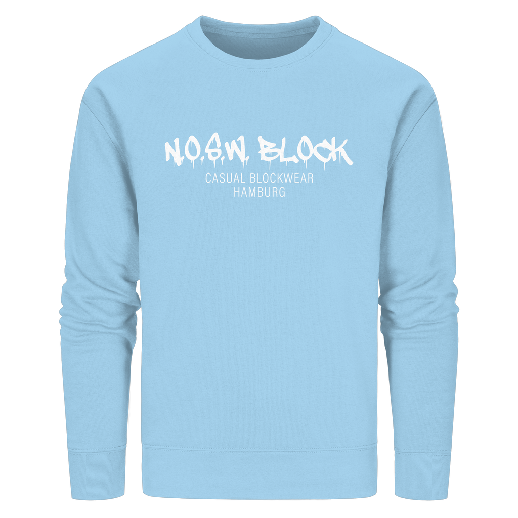 N.O.S.W. BLOCK Organic Sweater mit Brust-Druck "N.O.S.W. BLOCK CASUAL BLOCKWEAR HAMBURG" in den Farben black, french navy, anthracide, canyon pink, red, khaki, india ink grey, sky blue, royal blue, bottle green, dark heather grey und burgundy.
