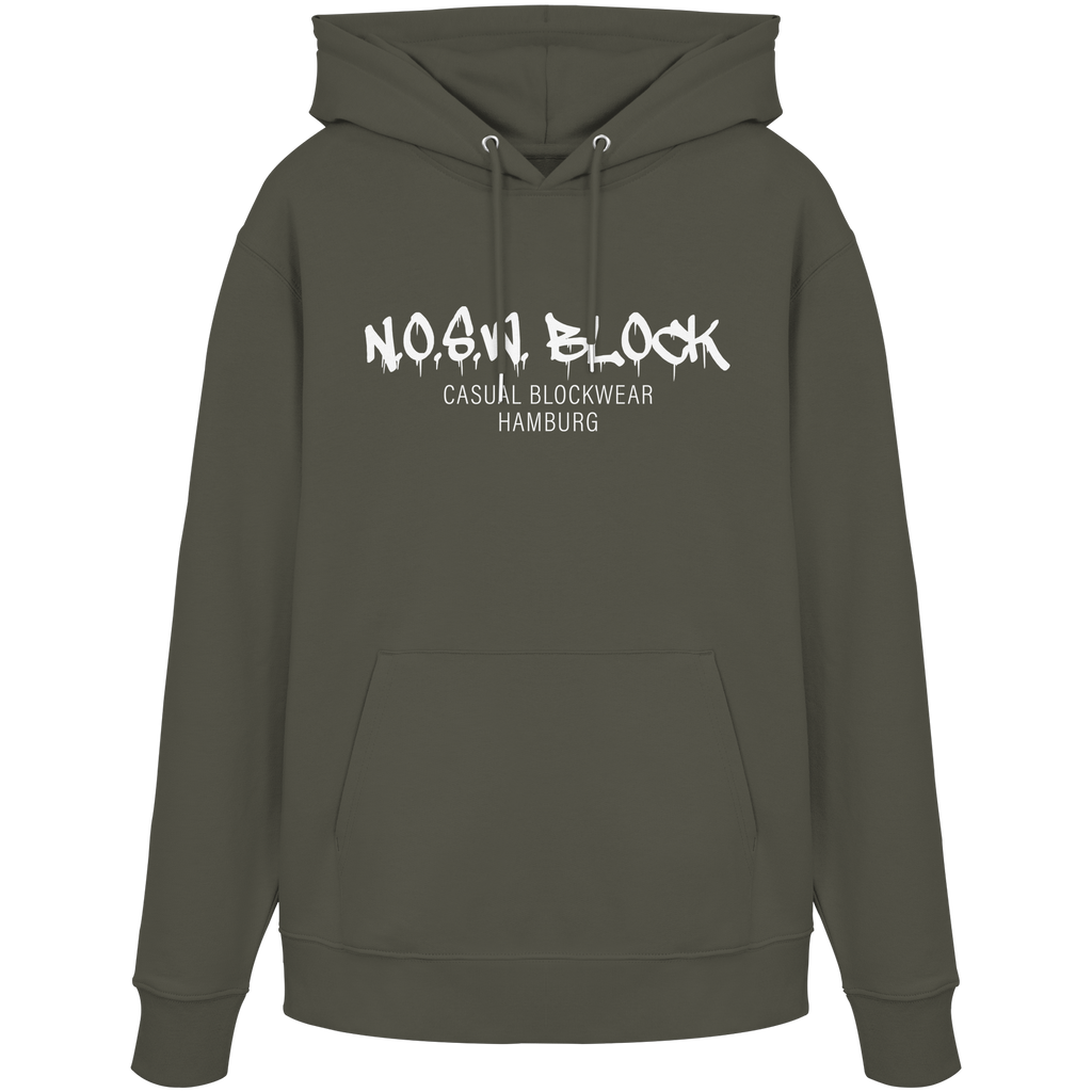 N.O.S.W. BLOCK Organic Hoodie mit Brust-Druck "N.O.S.W. BLOCK CASUAL BLOCKWEAR HAMBURG" in den Farben black, french navy, khaki, mid heather grey, india ink grey, desert dust, aloe, worker blue, glazed green, dark heather grey und burgundy.